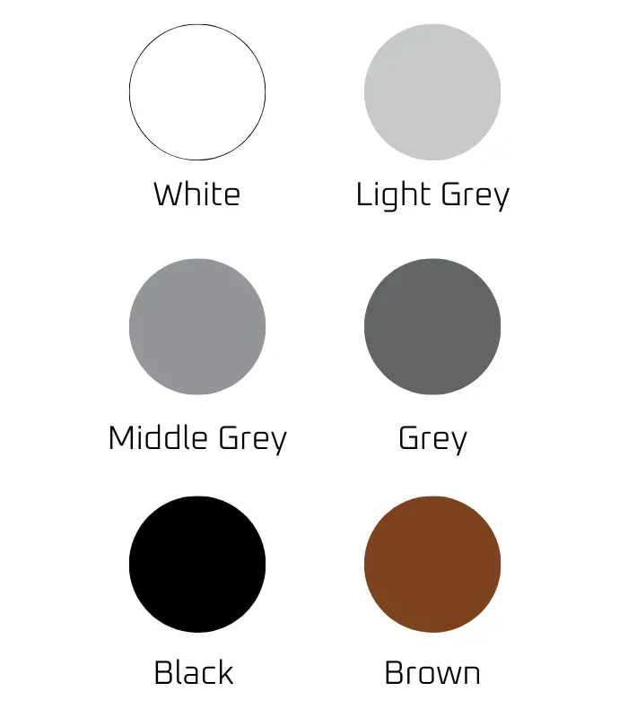 - Disponível em 6 cores: white, brown, light grey, middle grey, grey e black.